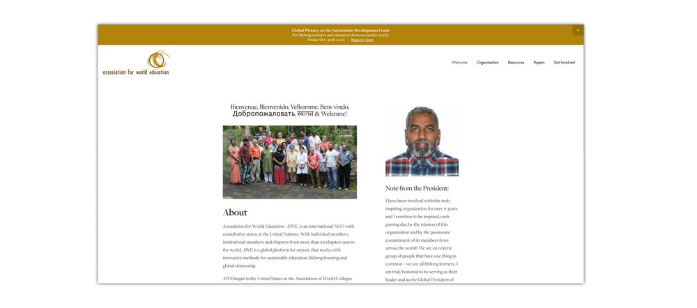 Association for World Education (AWE) is an international NGO with consultative status at the United Nations. With individual members, institutional members and chapters from more than 20 chapters across the world, AWE is a global platform for anyone that works with innovative methods for sustainable education, lifelong learning and global citizenship.